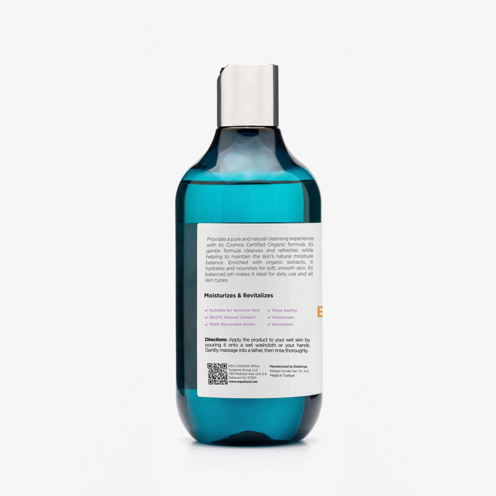 Aquatural Cosmos Certified Organic Body Wash offers an organic cleansing experience for your skin. Dermatologically tested, this gentle formula cleanses and revitalizes your skin while preserving its natural moisture balance. Infused with rich organic extracts, it hydrates and nourishes, leaving your skin feeling soft, smooth, and refreshed. Its balanced pH ensures that the body wash is kind to your skin, making it suitable for daily use and all skin types.