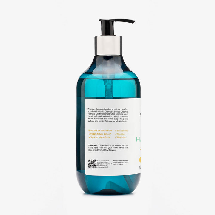 Aquatural Cosmos Certified Organic Hand Soap offers you the purest and most organic hand care. It provides effective cleansing, leaving your hands clean and moisturized without any irritation. Suitable for all skin types, it works to ensure that your hands remain clean and well- nourished, promotes skin health and supports the natural skin barrier. Directions: Dispense a small amount of the liquid hand soap onto your hands, lather, and then rinse thoroughly with water.